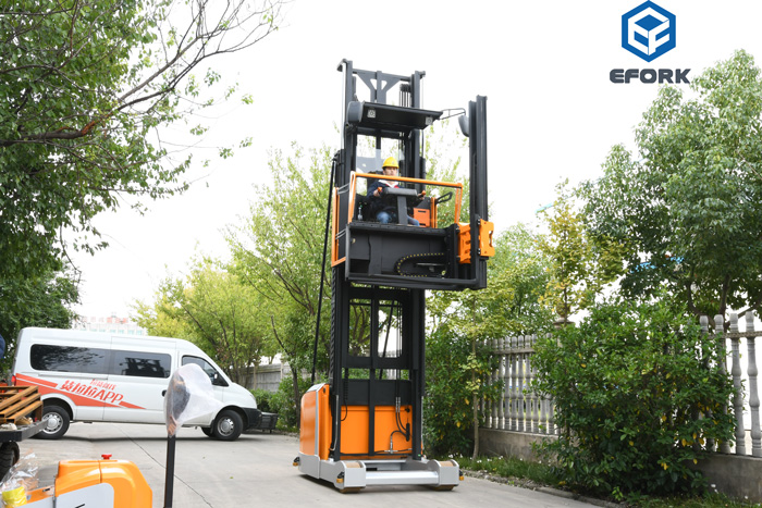 The three-way stacker forklift has a powerful high-position operation performance. The rated load and lifting height can be customized according to customer needs, rated load of 1500KG,  with the highest lifting height reaching 14.5 meters, meeting the stacking requirements of goods on high-position racks. The design of the operator following the forklift up allows the operator to have a panoramic view and pick goods manually while stacking, realizing the dual function of the stacker forklift and effectively improving operation efficiency.